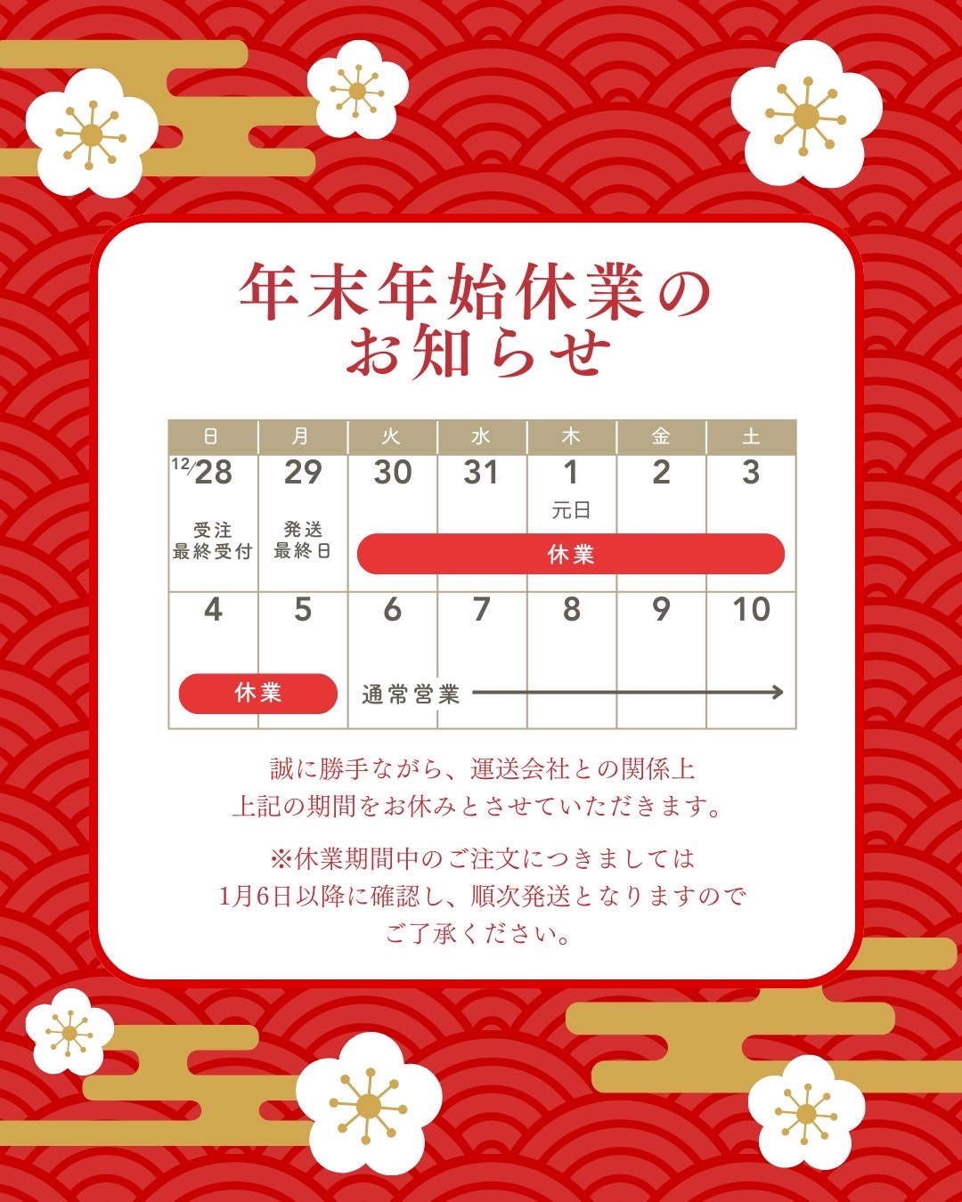 誠に勝手ながら、運送会社との関係上、2025年12月30日(火) ~ 2026年1月5日(月)の期間をお休みとさせていただきます。