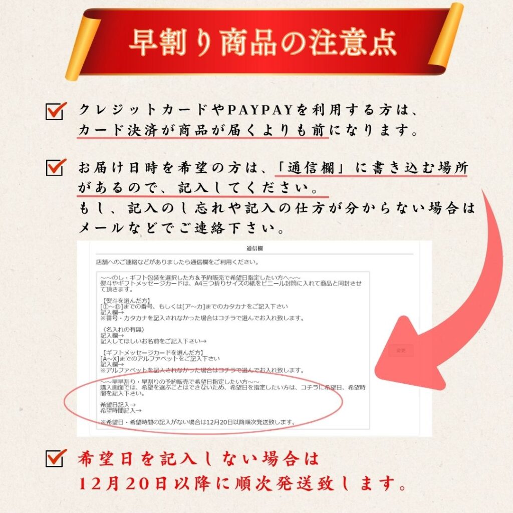 12月以降ご希望のお届け日や時間帯がある場合は、希望日時を選択できないため、ご注文時に「通信欄」へご記入いただければ対応可能ですので、忘れずにご記入をよろしくお願い致します!記入がない場合は、受注を確認したのち、順次発送になります!