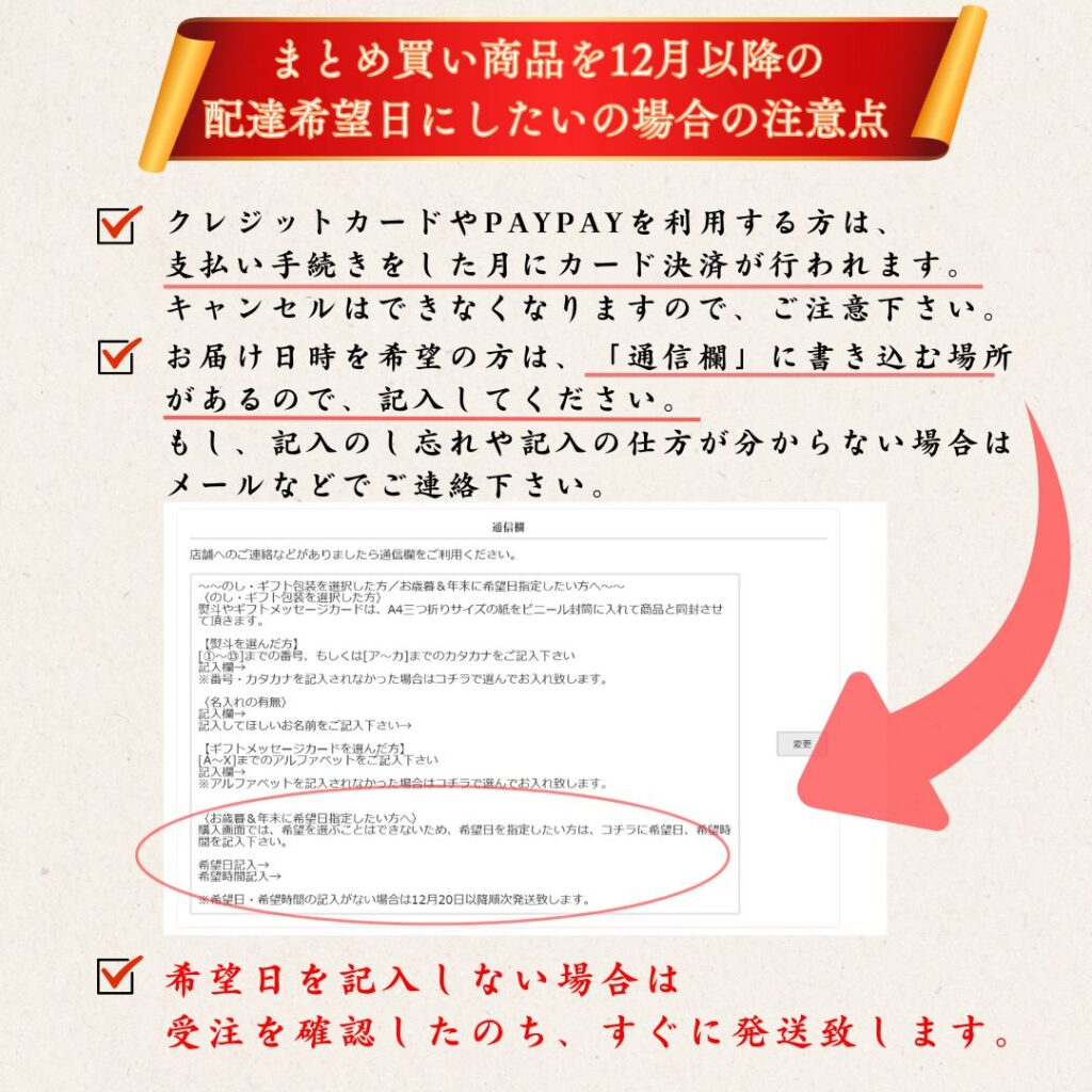 ①12月以降の希望日設定は、10月中のご購入では希望日時を選択できないため、ご注文時に「通信欄」へご記入いただければ対応可能ですので、忘れずにご記入をよろしくお願い致します!