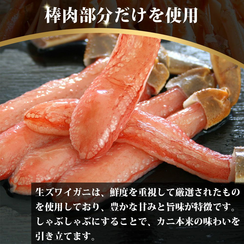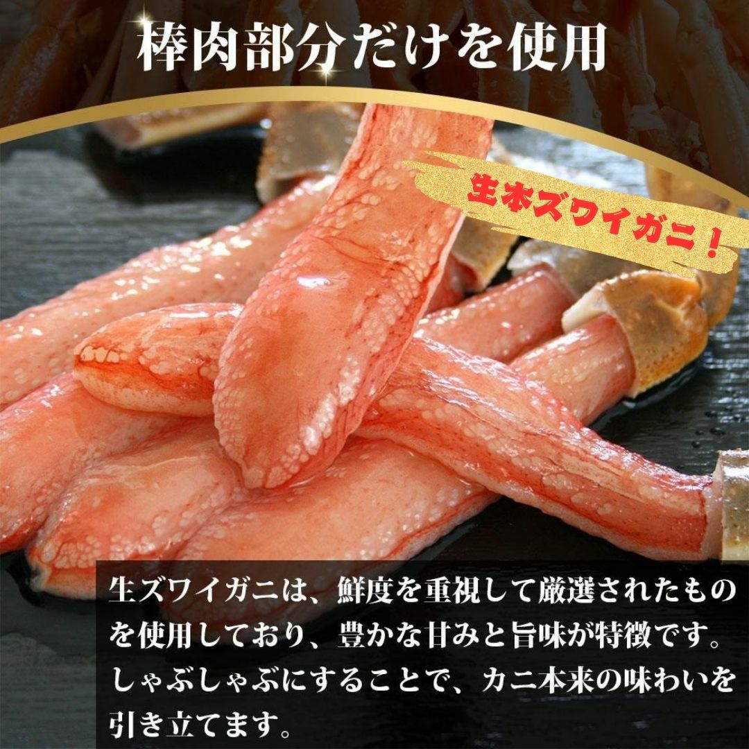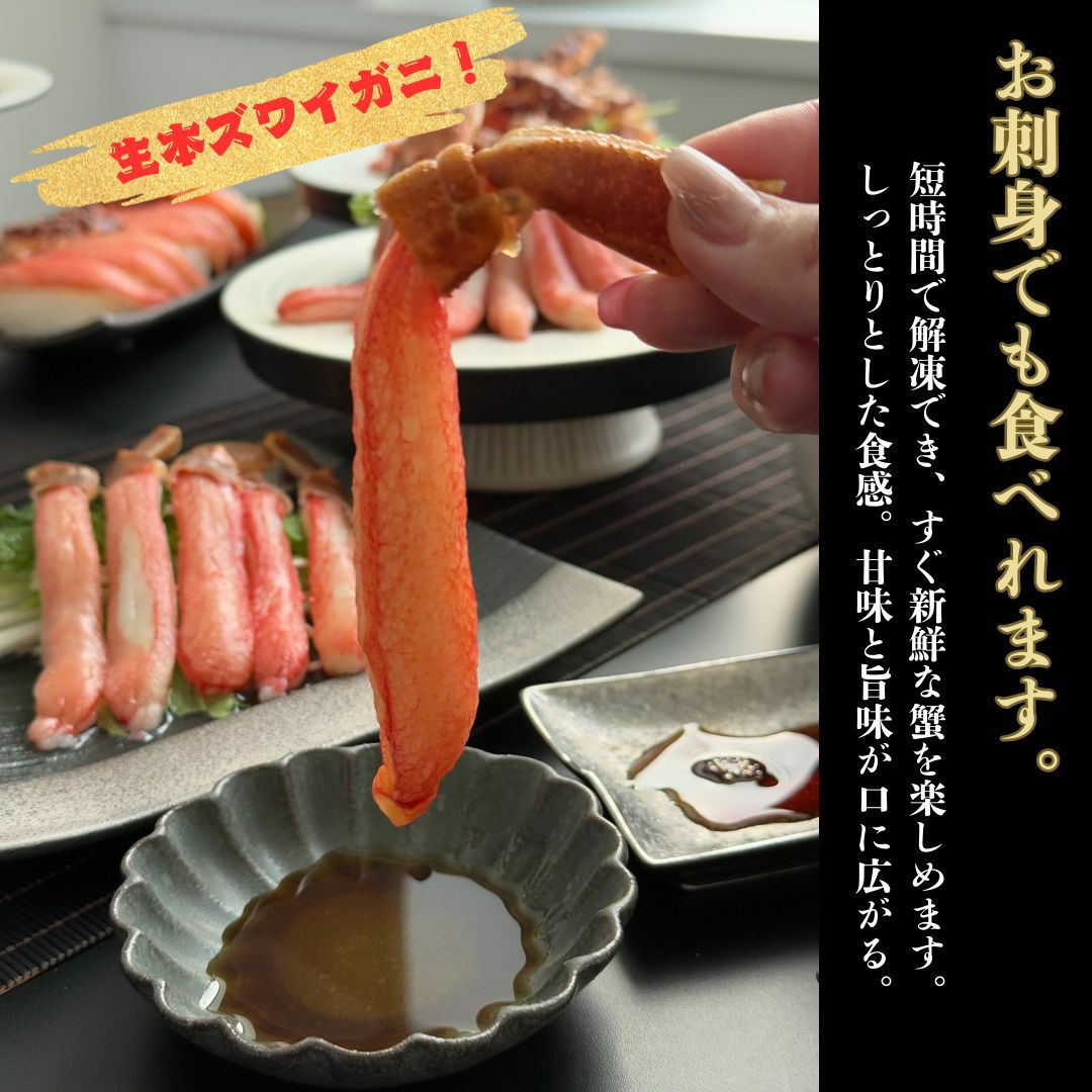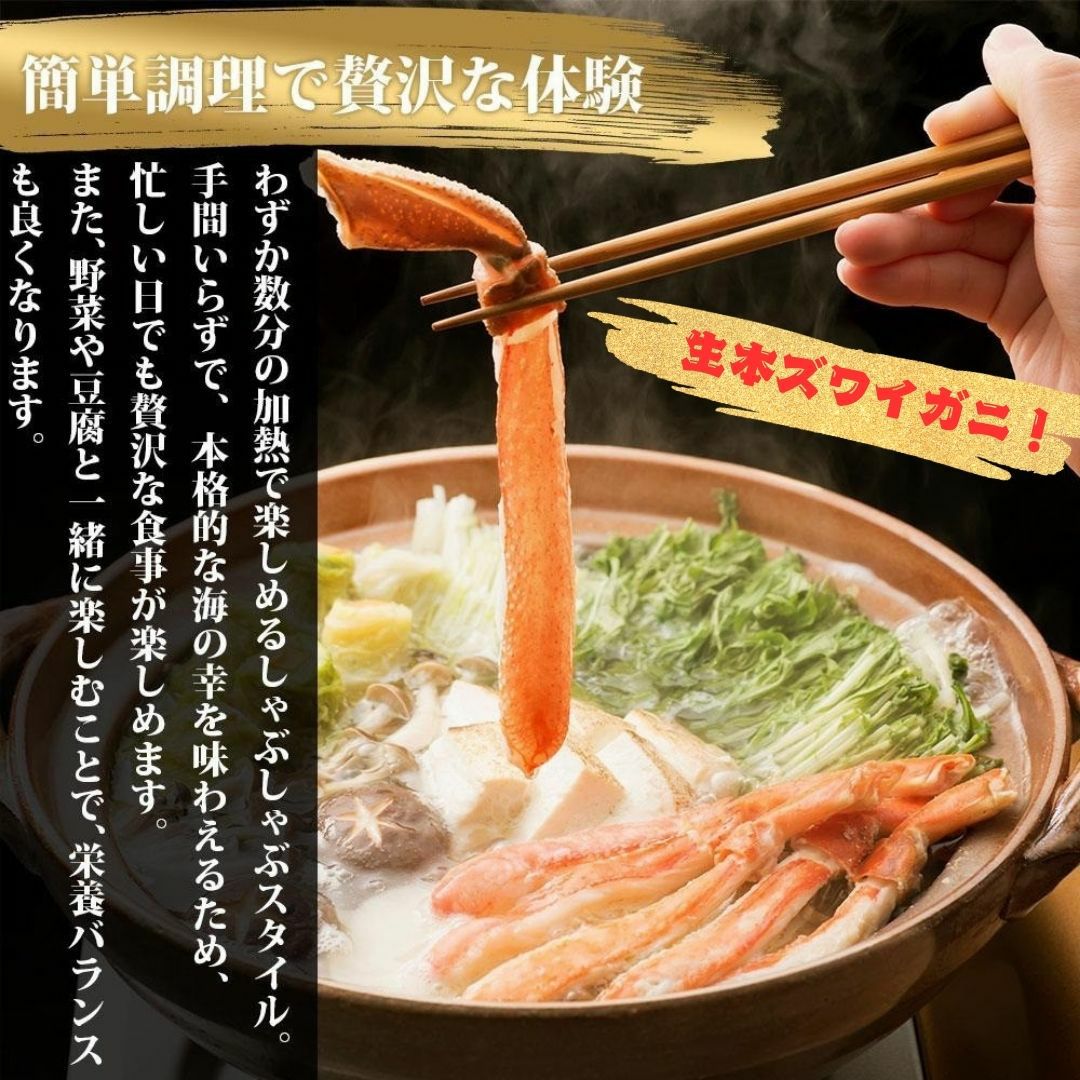 他の画像を見る 刺身でもしゃぶしゃぶでも楽しめる、贅沢な甘みの生本ズワイガニ。 生本ズワイガニ 500g(しゃぶしゃぶ用・お刺身OK)|北海道直送 送料込み 沖縄県のみ送料別 クール便(冷凍) 特別価格 ¥ 6,980 税込 とろける甘みと上質な旨みを持つ、北海道直送の生ズワイガニ500g。 カートに入れる お気に入りに登録する