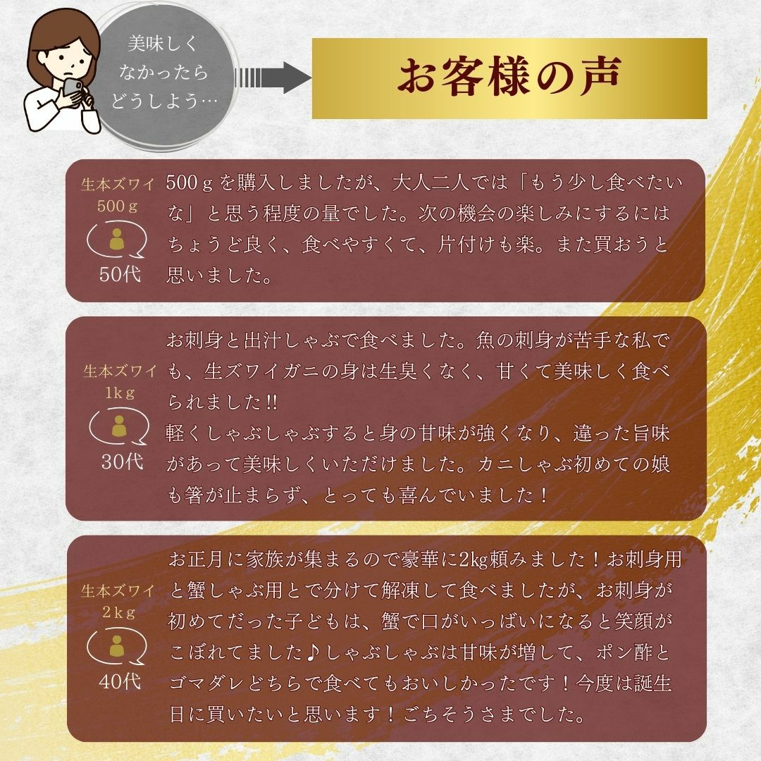 他の画像を見る 刺身でもしゃぶしゃぶでも楽しめる、ボリューム満点の本格ズワイガニ。 生本ズワイガニ 1kg(しゃぶしゃぶ用・お刺身OK)|北海道直送 送料込み 沖縄県のみ送料別 クール便(冷凍) 特別価格 ¥ 11,800 税込 贅沢な旨みをたっぷり味わう、北海道直送の生本ズワイガニ1kg。 カートに入れる お気に入りに登録する